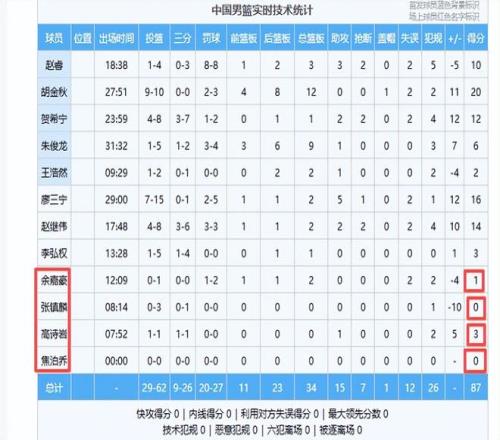 主帥郭士強第一節輪換了10名隊員,第二節輪換了11名隊員。焦泊喬成為唯一不上場的隊員。下半場郭士強實行了短輪換,張鎮麟、王浩然、李弘權遭到棄用,餘嘉豪也是僅僅打了12分鍾,下半場使用也不多。王浩然屬是新兵,僅得2分可理解,李弘權也是新人,第一次打國家隊,僅得3分,也不必多吐槽。最糟糕的就是在國家隊打了多年比賽的張鎮麟,事實證明已越來越不中用。全場他僅打了8分鍾,除高詩岩外他上場時間最少,也是全隊正負值最低的球員,在場輸10分。