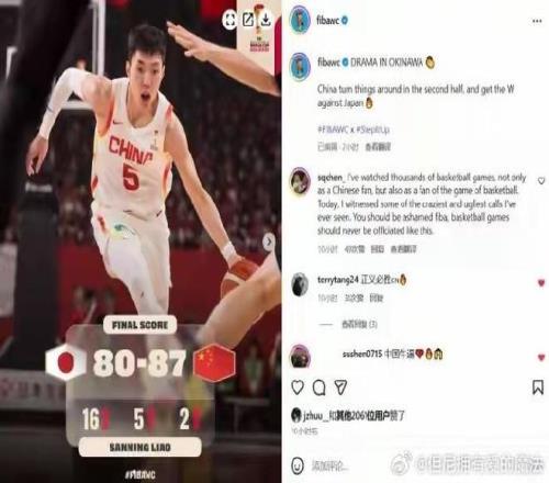 令人驚訝的是,賽後,FIBA世界杯的Instagram官方賬號卻這樣寫道:“衝繩神劇本!中國男籃從日本偷走一場勝利(China with a sneaky win over Japan)。”這樣的描述引發了評論區翻車。