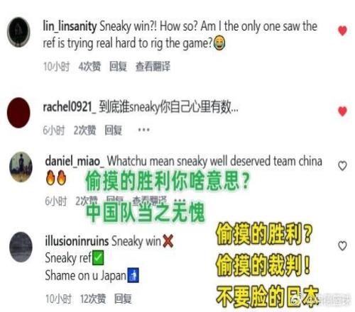 大批中國球迷湧入了評論區,給FIBA世界籃聯留言怒懟:“到底誰偷偷摸摸你自己心裏有數。”、“偷摸的勝利你什麽意思?中國隊當之無愧。”、“不是偷摸的勝利,而是偷摸的裁判。”,“偷摸的勝利?偷摸的裁判!不要臉的日本!”