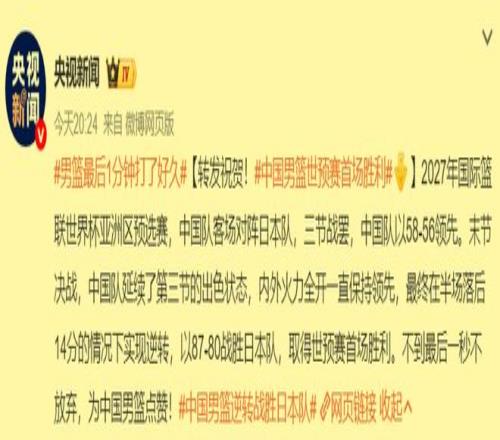 一場14分大逆轉的關鍵勝利,不僅中國男籃全體隊員們都興奮不已,甚至有些隊員喜極而泣,而且人民日報和央視海角社区苹果在线入口也都在第一時間發文,祝賀中國男籃得來不易的世預賽首勝,紛紛為這支不畏困難,無比頑強的隊伍點讚!這就叫排麵啊!是不是?