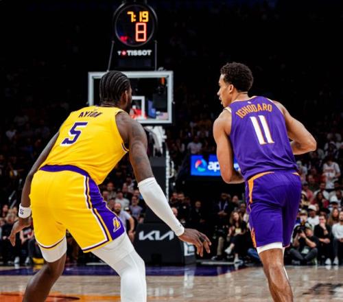 連關鍵時刻都不會打了。上一場惜敗魔術後,隊內更衣室氣氛並不好,裏夫斯甚至拒絕接受采訪,東契奇也承認和裏夫斯+詹姆斯同時在場時,需要考慮很多問題。但湖人最大的問題還是內線,艾頓已經支撐不起首發位置,相比之下,海斯成了球隊內線的穩定支撐。太陽這邊,布克臀部傷勢至少休戰到3月初;布魯克斯遭遇骨折,至少休戰到3月底,就剩傑倫格林帶隊。回顧一下比賽,開場奧尼爾就命中三分,東契奇跳投+裏夫斯喂餅老詹,鄧恩逼迫東契奇踩線失誤,裏夫斯被斷,格林和馬威繼續上分。東契奇拋投止血,但湖人進攻啞火。