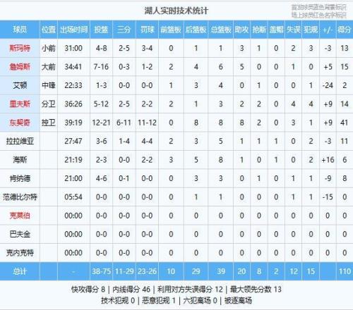 湖人:東契奇41分8板8助2斷、詹姆斯15分6板5助、裏夫斯14分3板2助2斷、斯瑪特13分1板3助、拉拉維亞11分5板1助、肯納德8分3板、海斯6分8板1助、艾頓2分4板