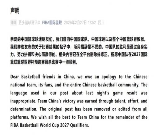 就在2月27日晚上7點,FIBA國際籃聯官方發布了一則聲明,強調因昨日中國男籃戰勝日本男籃的比賽結果帖子中的措辭不當,向中國男籃、中國球迷以及整個中國籃球界致歉。