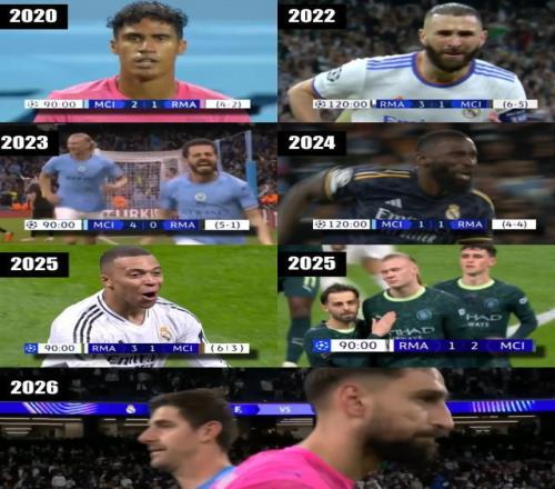 歐冠16強抽簽出爐,曼城和皇馬再次分在一起,這是兩隊連續第5個賽季在歐冠淘汰賽相遇,刷新了曆史紀錄,從2020年1/8決賽開始到本賽季,雙方交戰13次,其中本賽季已在聯賽階段有過1次交鋒,曼城客場2比1獲勝。
