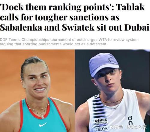 這番言論並非危言聳聽。此前,迪拜賽事總監塔拉克在麵對薩巴倫卡和斯瓦泰克退賽時就已情緒失控,他公開質疑退賽理由“有點奇怪”,並憤怒地表示罰款對於年入千萬的巨星來說如同隔靴搔癢,呼籲WTA應當對無故退賽的球員實施扣除排名積分的嚴厲處罰 。