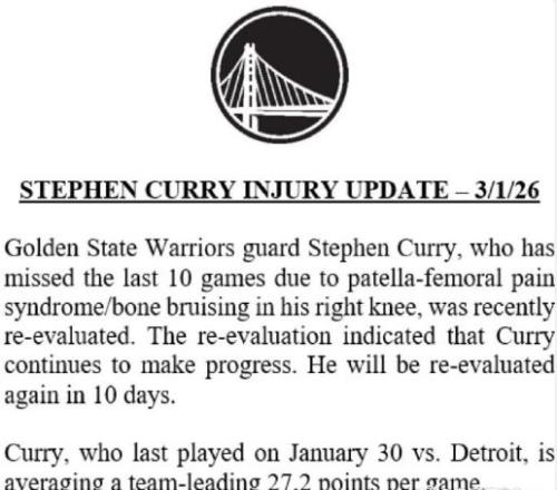 北京時間3月2日,當庫裏生涯第2次因傷缺席整個2月份的比賽,如今根據勇士官方傷病報告顯示,庫裏將在10天後去複診他的跑步膝,也將至少再缺席5場比賽,對於勇士整體戰鬥力是極大的削弱。