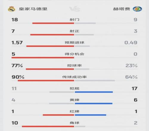 賽後的數據統計荒誕得像個笑話:皇馬控球率77%,射門18次,射正7次,預期進球(xG)高達1.57,角球10個;而赫塔費呢?控球率僅23%,射門9次,射正3次。