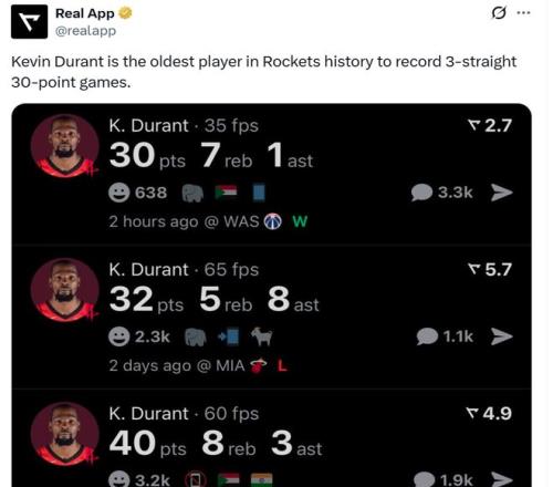 憑借這樣的表現,杜蘭特已經連續三場轟下30+得分表現,分別是30分、32分和40分,三場合砍102分,讓37歲155天的杜蘭特成為火箭隊史創造這一壯舉最老的球員。