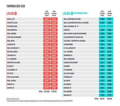 北京時間3月3日,西甲官方公布了各支球隊的最新工資帽,其中巴薩的工資帽從3.51億歐元提高到4.32億歐,馬競的工資帽從3.269億歐增加至3.362億歐,皇馬則沒有變化。