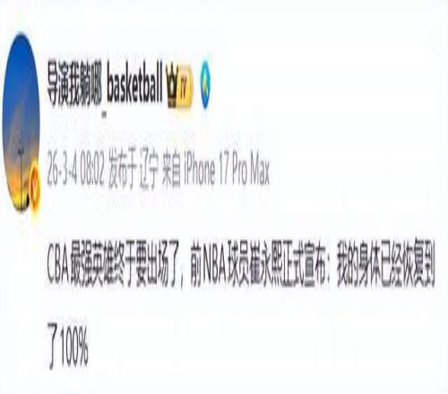根據著名媒體人導演我躺哪報道,這位曾在NBA夏季聯賽嶄露頭角的年輕鋒線,通過個人社交媒體正式宣布:“我的身體已經恢複到了100%。”短短一句話,就像一顆投入湖麵的巨石,瞬間在籃球圈激起千層浪。而更讓球迷熱血沸騰的是,他的複出首秀,就要對陣聯賽中的勁旅新疆隊。