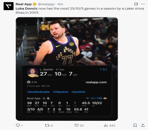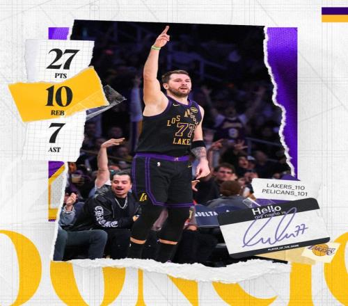 東契奇此役再度創造紀錄,在2026年東契奇20次20+5+5聯盟第一,單賽季14次拿到25+10+5是湖人隊史2001年奧尼爾後首人。