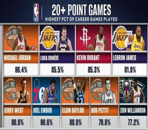 此外,東契奇還創下了NBA曆史第2的神跡。數據顯示,NBA曆史20+場數占比:邁克爾喬丹以86.4%獨居第1,東契奇(85.5%)高居第2、杜蘭特(85.3%)第3、詹姆斯(81.9%)排名第4。