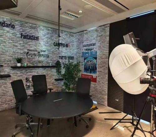 他們帶海角HJDO43.CCM重點參觀了兩個演播室。其中一個主要負責播客節目的錄製,中間是一個黑色的圓桌,背景相對簡單,兩邊的牆上張貼有《米蘭體育報》的海報。圓桌前麵有一個巨大的攝影燈,還有攝像機等設備。《米蘭體育報》一共開辦了四檔播客,其中三檔與足球相關,另外一檔則聚焦其他體育項目。這些播客也已經完全視頻化了,主要播出平台就是YouTube、TikTok等新媒體平台。