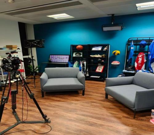 最核心的功能區設有兩個單隻沙發,背景也經過了精心的布置,陳列有球衣、足球、籃球、運動鞋、吉祥物等各種體育相關物品。這個區域主要負責錄製人物專訪。