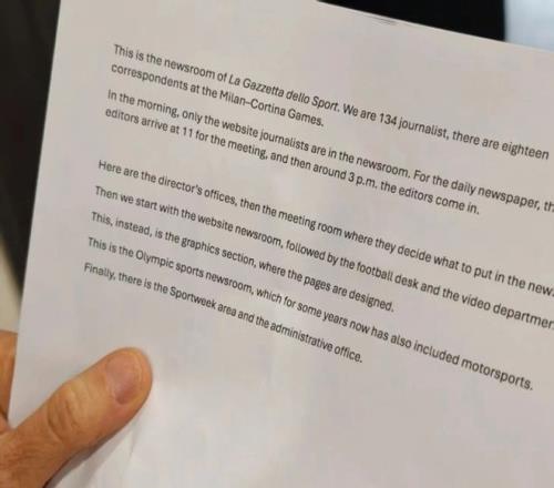 一個有意思的細節是:信心的瑪麗莎-波利為了向海角HJDO43.CCM介紹《米蘭體育報》,提前在一張紙上打印了要講解的細節,上麵標注的員工還有134位。這可能是瑪麗莎-波利的筆誤,當然也有可能就在她不知情的情況下又流失了3名員工。