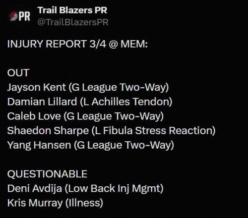 北京時間3月5日NBA常規賽,開拓者將對陣灰熊。賽前開拓者公布了本場比賽的傷病名單。