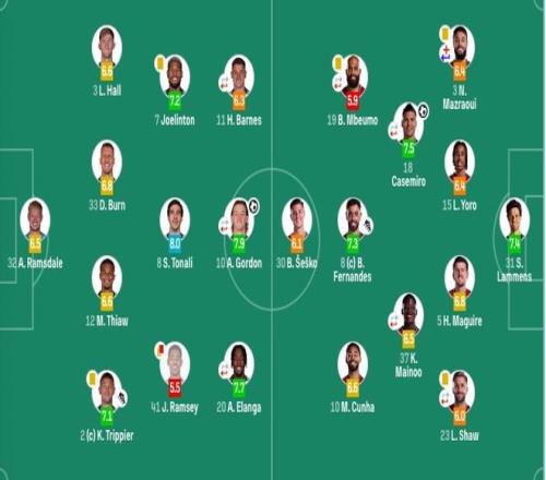 紐卡首發:32-拉姆斯代爾、2-特裏皮爾、3-劉易斯·霍爾、12-佳夫、33-丹-伯恩、7-喬林頓、8-托納利(97'4-博特曼)、41-雅各布·拉姆塞、10-戈登(85'23-雅各布·墨菲)、11-巴恩斯(46'28-威洛克)、20-伊蘭加(85'18-奧蘇拉)