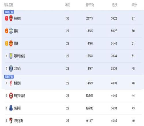 這樣多場比賽之後,英超最新積分榜出爐。加上前一天利物浦被狼隊2-1擊敗,最新的競爭形勢是,多賽一場的阿森納67分穩居第一。曼城緊隨其後60分排名第2,曼聯、阿斯頓維拉拿到51個積分,分列第3、第4,而身後兩大豪門切爾西、利物浦同積48分,對歐冠區域虎視眈眈。
