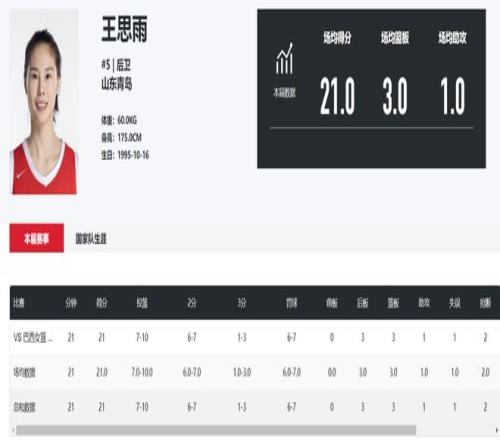 此役王思雨全場比賽替補20分鍾,10中7,三分3中1,罰球7中6,拿到21分3籃板1助攻2搶斷僅1失誤,命中率70%,她的個人表現比多位年輕核心更出色。
