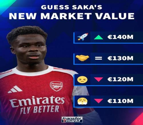 在德轉3月9日將會更新英超球員身價的情況下,他們也對現有身價1.3億歐元的薩卡進行了身價預熱。在德轉給出的4個選項中,薩卡身價最高漲至1.4億歐元,其次是1.3億歐元保持不變,然後是下降至1.2億歐元以及1.1億歐元。