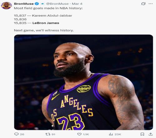除此之外詹姆斯運動戰進球已經15835個,他距離賈巴爾的15837個隻差2個,距離超過賈巴爾隻差3個,下一場比賽就能超過成功成為曆史第一。