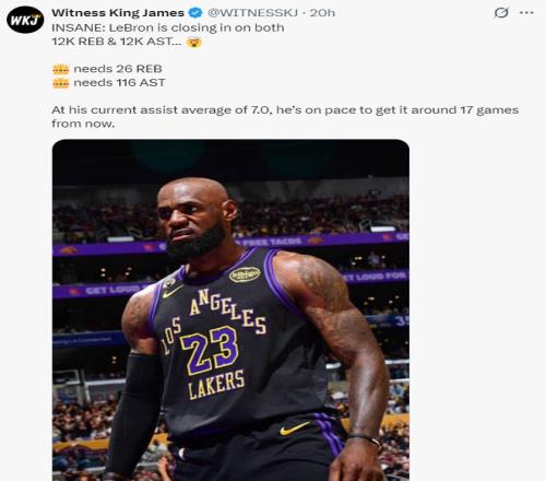 41歲的勒布朗也會迎來多項裏程碑的時刻,他距離12000籃板、12000助攻隻差26個籃板與116次助攻,按照詹姆斯場均7個助攻來看他隻需要17場比賽就超過這兩裏程碑。