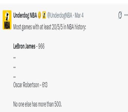 對陣鵜鶘拿到21+7+7後,詹姆斯生涯已經拿到966場20+5+5繼續刷新曆史第一,奧斯卡-羅伯特森613場20+5+5曆史第二,其餘的球員沒有一人達到500場。勒布朗-詹姆斯有多項數據將達成曆史第一,這就是GOAT的魅力,曆史最長的河果然名不虛傳。