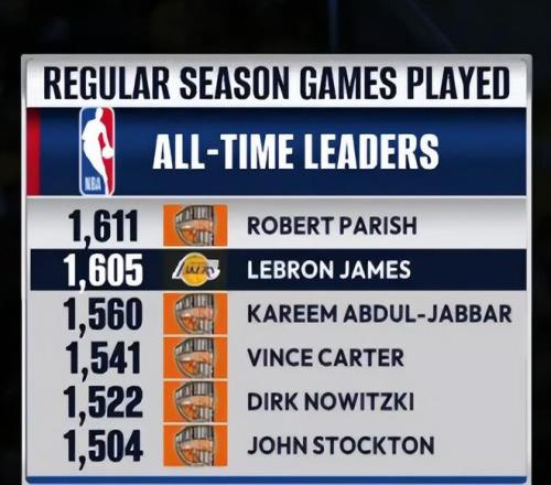 詹姆斯已經完成1605場比賽,距離帕裏什1611場隻差6場,詹姆斯超越帕裏什隻需要7場比賽,詹姆斯又要升曆史第一了。