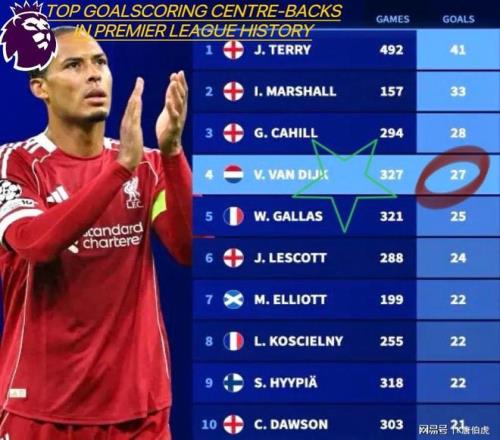 英超後衛進球榜:範戴克上升至曆史第二(不包括點球)