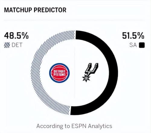 馬刺上一場大勝76人,過去13場賽事贏下12場,以44勝17負位列西部第二,本賽季馬刺表現驚豔,球隊攻防效率均躋身聯盟前十,內線文班亞馬的防守威懾力毋庸置疑,外線卡斯爾、瓦塞爾等人運動能力出眾,全隊防守壓迫性十足,同時多達8人場均得分上雙。結合兩隊現狀,雙方均為聯盟年輕新生力量,防守表現同樣出色。活塞進攻主要依靠坎寧安帶動,但他近期狀態不算穩定;馬刺得分點更為分散,兩隊上月24號首次交手,馬刺曾114-103擊敗活塞!ESPN預測本場比賽,馬刺勝率51.5%,活塞勝率48.5%。