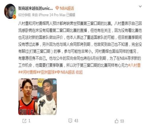 至於日本男籃的後場核心球員河村勇輝也是類似的情況:“河村勇輝也麵臨同樣的情況,有意願但身不由己。他與公牛的雙向合同也將在6月份到期,為了在NBA尋求新的工作機會,他需要打NBA夏季聯賽,所以對於第三窗口期的比賽,同樣有心無力。”