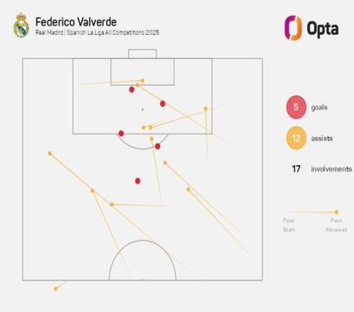 至此,巴爾韋德本賽季代表皇家馬德裏在各項賽事已直接參與17球(5球12助),追平皇馬生涯單賽季第二多參與進球紀錄(2024-25賽季也是17球),僅次於2022-23賽季的19球。