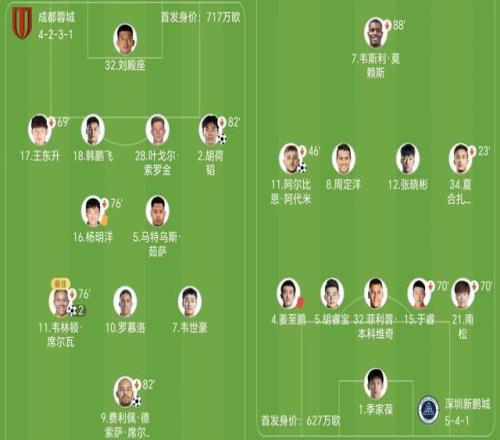 蓉城主教練約翰-阿洛伊西派上費利佩單箭頭,身後是韋林頓-席爾瓦、羅慕洛和韋世豪。新鵬城主帥陳濤則派出韋斯利突前,阿代米、周定洋、本科維奇上陣。