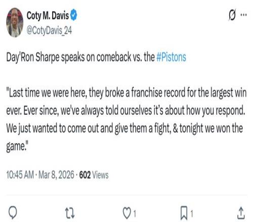 不僅終結了聯盟現存最長的10連敗,還讓活塞隊遭遇3連敗,排名被西部第二馬刺反超跌至聯盟第三的同時,領先東部第二凱爾特人的優勢也被縮小到3.5個勝場,後者又迎回核心塔圖姆,讓東部第一的歸屬重燃懸念。