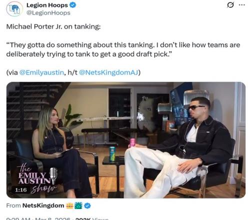 賽後他也公開炮轟本賽季聯盟風行的擺爛行為:“聯盟得對這種擺爛行為做點什麽了,我很討厭一些球隊為了拿到更好的簽位故意擺爛輸球。”