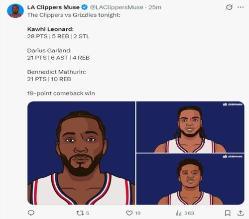 這場比賽快船隊再也不是隻依靠倫納德一人,加蘭26分鍾20中8+三分8中3拿到21分6助攻4籃板;馬瑟林35分鍾,15中6,罰球9中9拿到21分10籃板。