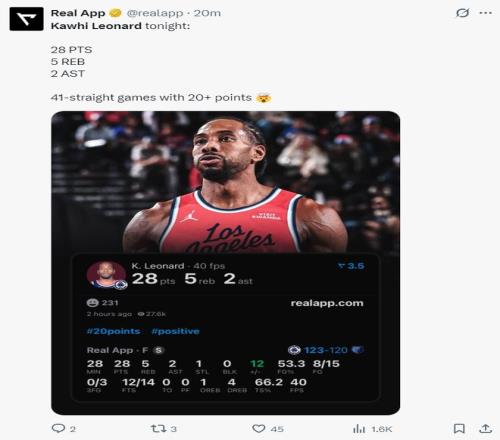 這場比賽科懷-倫納德延續了個人的紀錄:1.連續41場比賽拿到20+生涯新高;