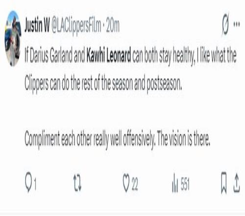 美媒盛讚加蘭與倫納德保持健康的話這支快船在本賽季剩餘時間與季後賽能有所作為,而且健康的倫納德極具侵略性,他健康時就是無解的存在。