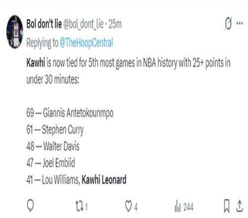 4.在不到30分鍾時間裏拿到25+的場次倫納德已經41次與路威並列曆史第五,第一是字母哥69次。