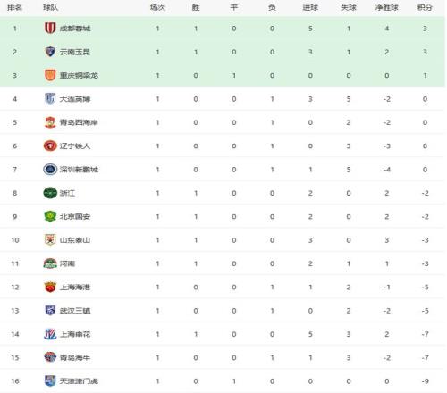 中超第一輪安排在三個比賽日進行,揭幕戰成都蓉城對陣深圳新鵬城,深圳在阿利米先進一球的情況下錯失好局,薑至鵬被紅牌罰下,席爾瓦扳平比分,費利佩和胡荷韜進球完成反超。多打一人的成都蓉城在下半場連續進球,席爾瓦梅開二度,廖榮祥進球,最終成都蓉城5比1擊敗深圳,取得開門紅,拿到4個淨勝球,排名第一位。