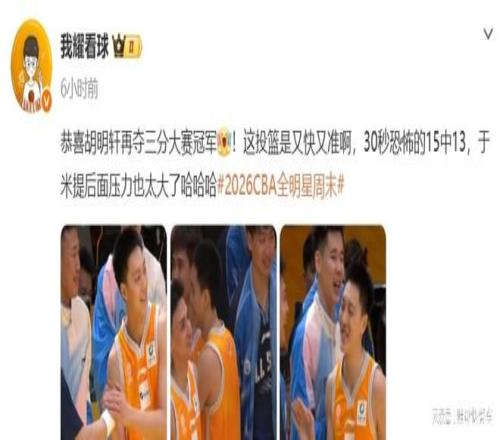 2026年CBA全明星三分大賽決賽,胡明軒終於大爆發了。在常規時間裏,他投出了22分的高分,與於米提打成平手。雙方在隨後的加時階段,胡明軒再度上演神跡投射,在短短30秒內,他出手15次,命中13球,命中率達到驚人的86.7%。從這一次三分球大賽來看,胡明軒的狀態依舊滿血回來了,看樣子,郭士強在前陣子世預賽放棄胡明軒,確實有點後悔了。
