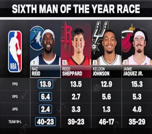 本賽季,火箭隊的謝潑德場均可以貢獻13.5分2.7籃板3.3助攻。前62場比賽,火箭隊拿到了39勝23負的戰績,位居西部第3位。另一位是森林狼隊的第6人納茲裏德,他本賽季場均可以貢獻14+6+2的數據。另外就是馬刺隊的鋒衛搖擺人凱爾登約翰遜,本賽季他場均可以貢獻13+5+1的數據,而熱火隊的替補前鋒小海梅哈克斯,本賽季場均可以貢獻15+5+4的數據。