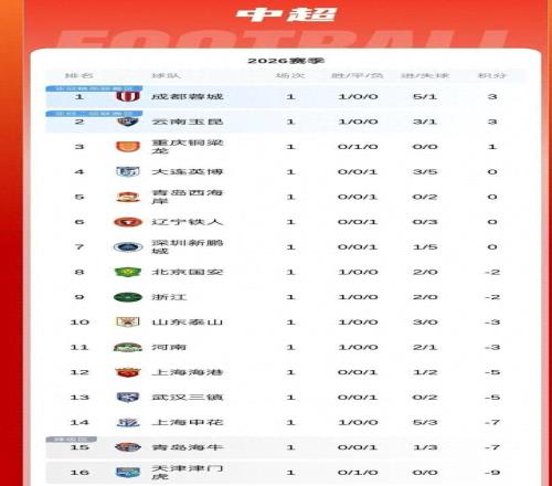 2026賽季的中超聯賽戰火重燃,目前16支球隊都已經結束了首輪較量,除了天津津門虎與升班馬重慶銅梁龍0:0握手言和,其他7場比賽都有進球入賬,其中成都蓉城更是用殘暴的5:1迎來賽季首勝。那首輪比賽戰罷,各支球隊目前的積分如何?本賽季哪支球隊又有望成為爭冠熱門呢?