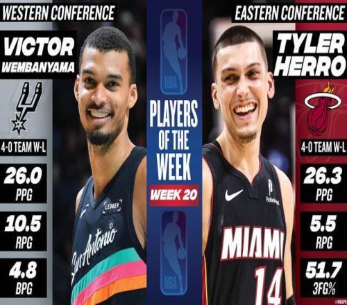 北京時間3月10日,NBA官方宣布,馬刺中鋒維克托-文班亞馬和熱火後衛泰勒-希羅被評為第20周的周最佳球員。