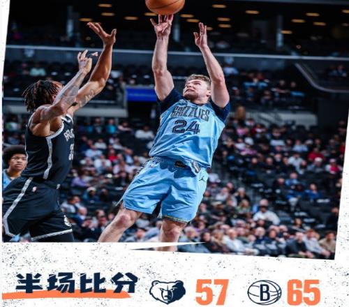 次節比賽,籃網連續兩節單節得分30+,且限製灰熊第二節本場首次單節不足30分。籃網多點開花逐步取得43-35領先優勢,灰熊連追4分,籃網用團隊攻勢逐步擴大53-41領先優勢。籃網繼續擴大60-47領先優勢,灰熊一波10-5攻勢追分,籃網單節32-26淨勝6分,上半場結束籃網65-57領先灰熊。前兩節比賽,灰熊三分20中9,呂佩爾4記三分16分、韋爾斯12分與普洛斯珀11分;籃網三分13中7,特拉奧雷11分與夏普10分。