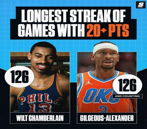 1.SGA連續126場比賽拿到20+刷新生涯新高;