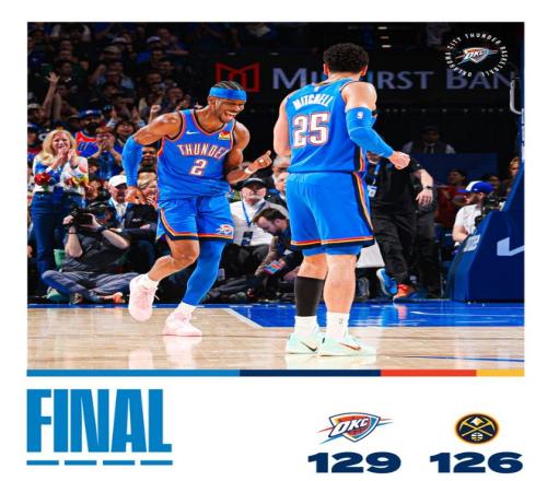 亞曆山大這場比賽展現出了逆天的關鍵球才能,而且他已經連續三場比賽在關鍵時刻命中關鍵球。終場前13秒亞曆山大的撤步三分幫助雷霆領先,但約基奇三分命中+穆雷被犯規1罰命中掘金扳平,終場前8秒雷霆有完成的進攻時間,最終SGA麵對瓊斯命中了三分準絕殺。