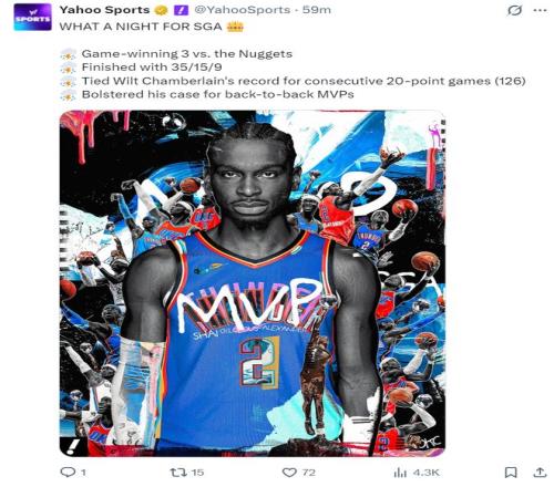 賽後雅虎體育盛讚SGA,他不僅連續126場拿到20+,他還命中了絕殺三分,他已經準備好蟬聯MVP了。