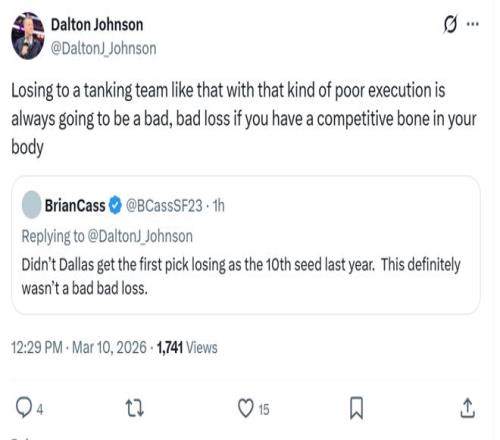勇士記者Dalton Johnson給出了相同的看法:“輸給這樣一支糟糕的擺爛球隊,對於任何有競爭心的人來說,都是一場極其糟糕的失利。”