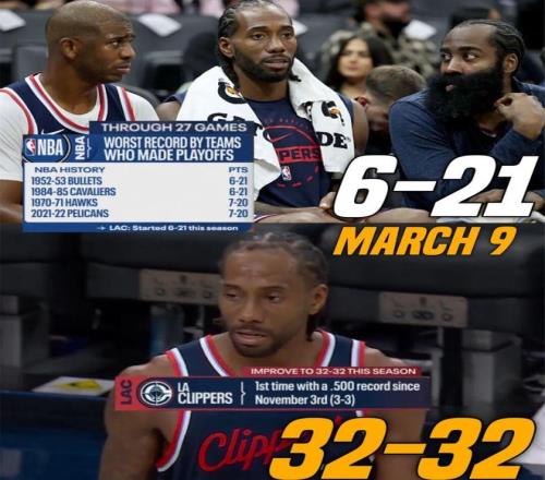 至於快船,同樣因為前期挖坑太大,目前32勝32負隻能排在西部第八,且距離西部第七的太陽(37勝27負)差了5個勝場、距離第六的掘金(39勝26負)差了6.5個勝場。